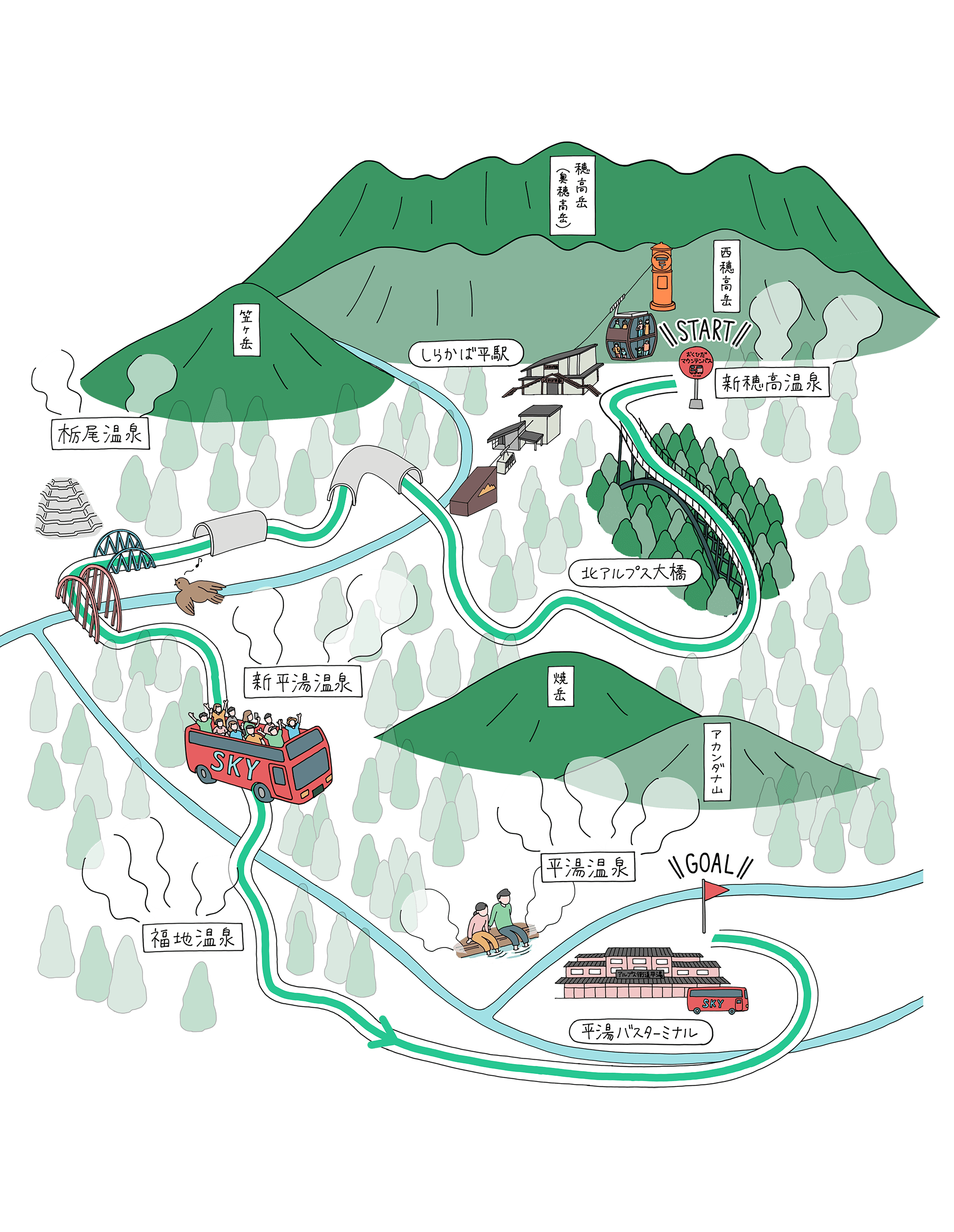 奥飛騨温泉郷の玄関口、平湯バスターミナルから新緑の旅へ出発。山あいを進むバスの車窓には、春の訪れを告げる鮮やかな景色が広がります。